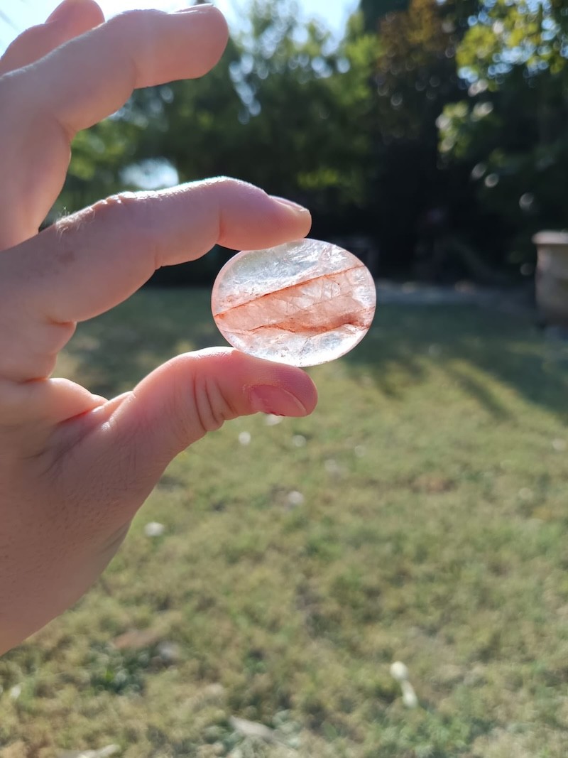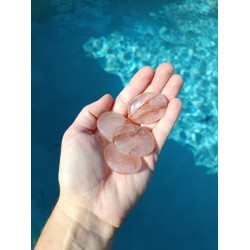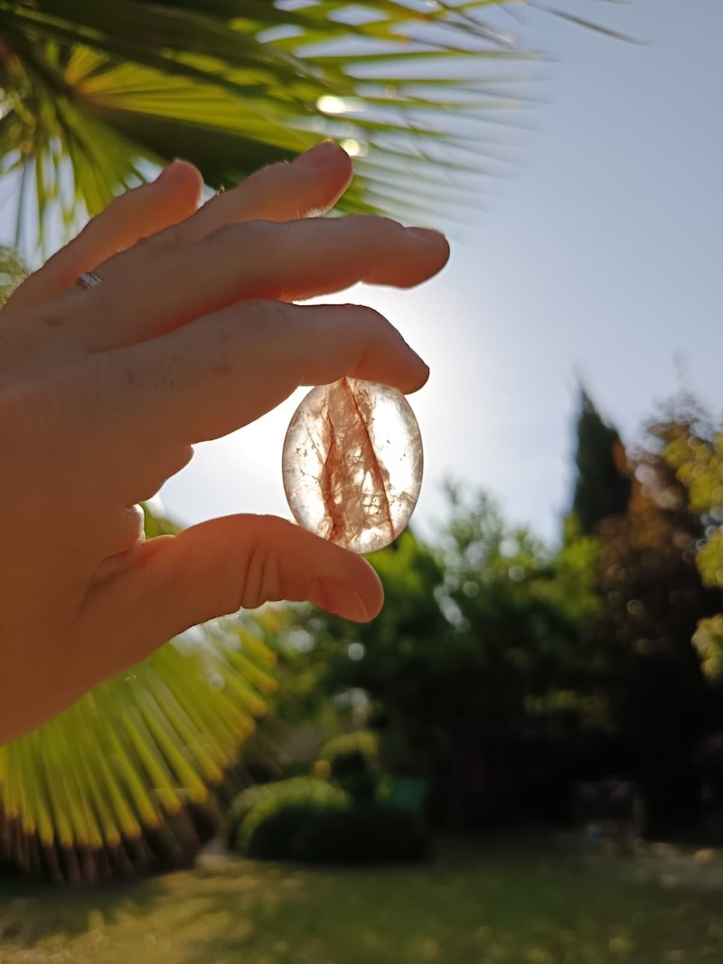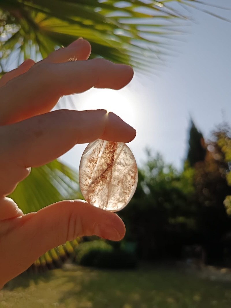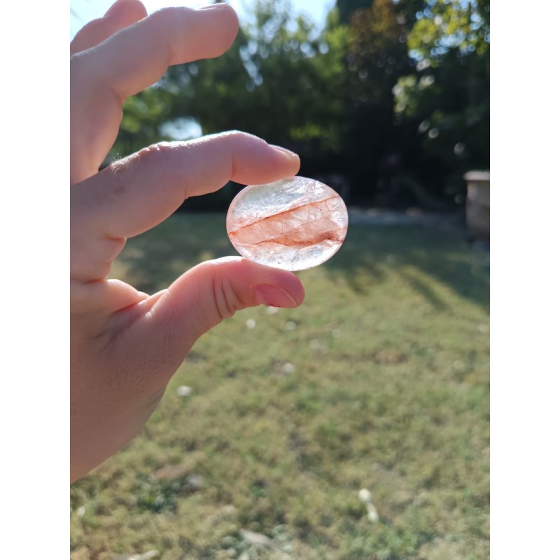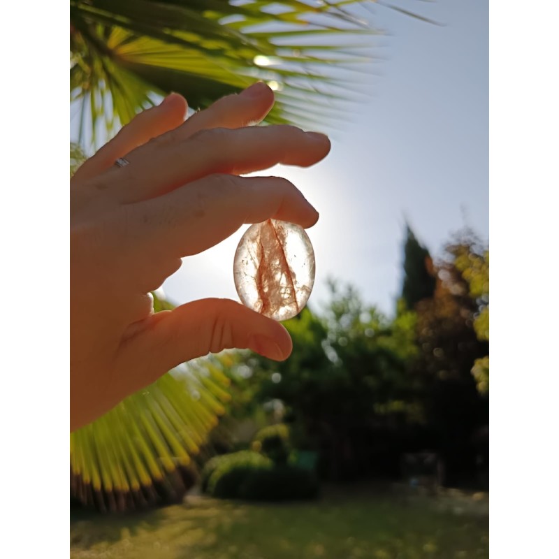 Magnifique galet en Quartz Hématoïde de qualité AA, provenance Brésil. Pierre d’ancrage et d’harmonie qui aide à équilibrer les émotions et renforcer la vitalité.