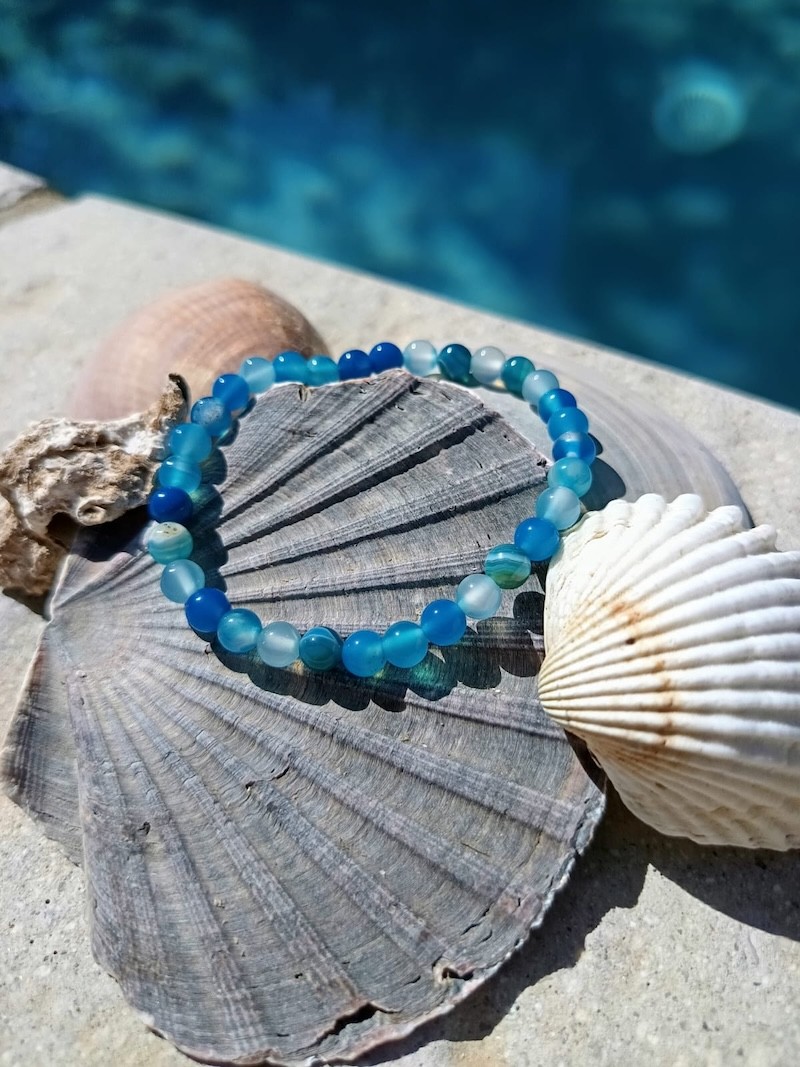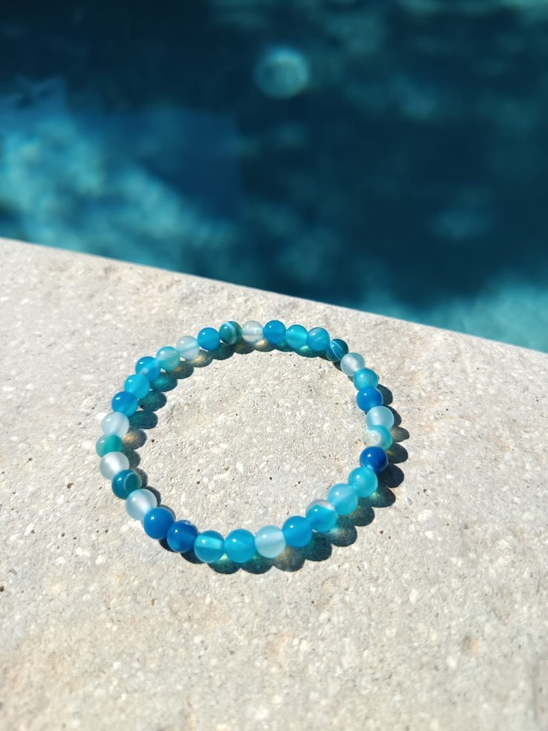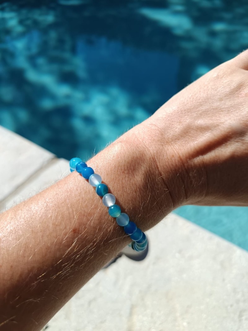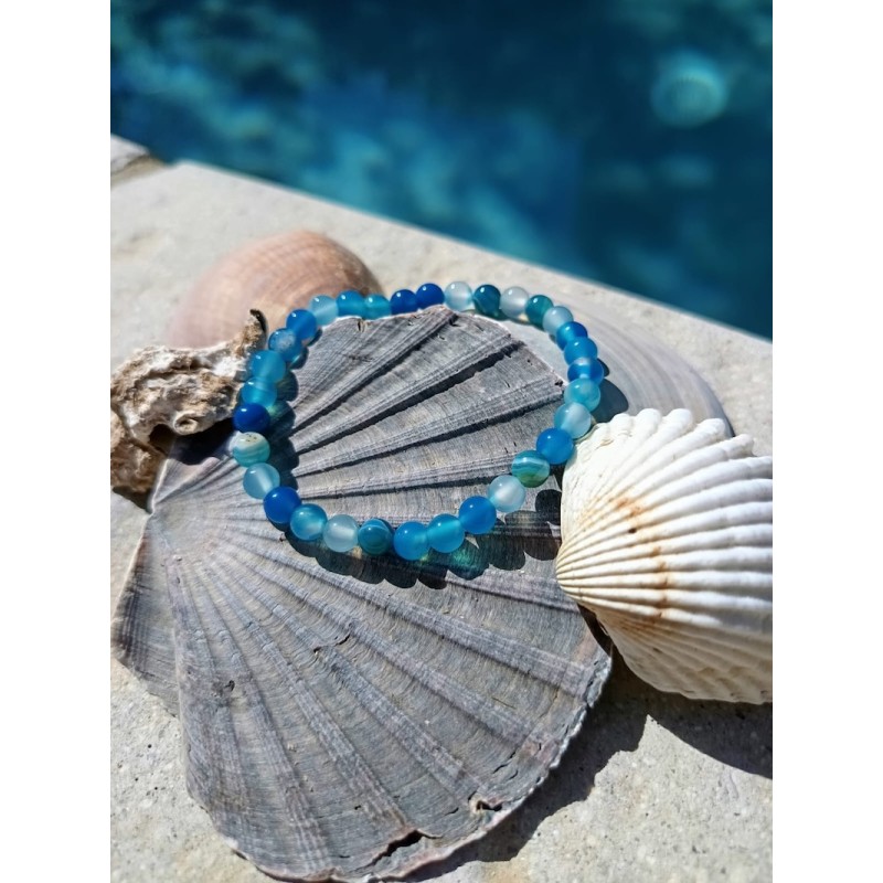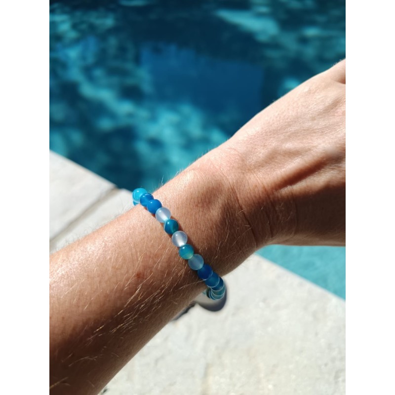 Laissez-vous séduire par ce bracelet en agate bleue teintée composé de perles rondes de 6 mm, montées sur un fil élastique résistant. Chaque perle présente des nuances bleues rappelant l'océan, pour un effet apaisant et raffiné.