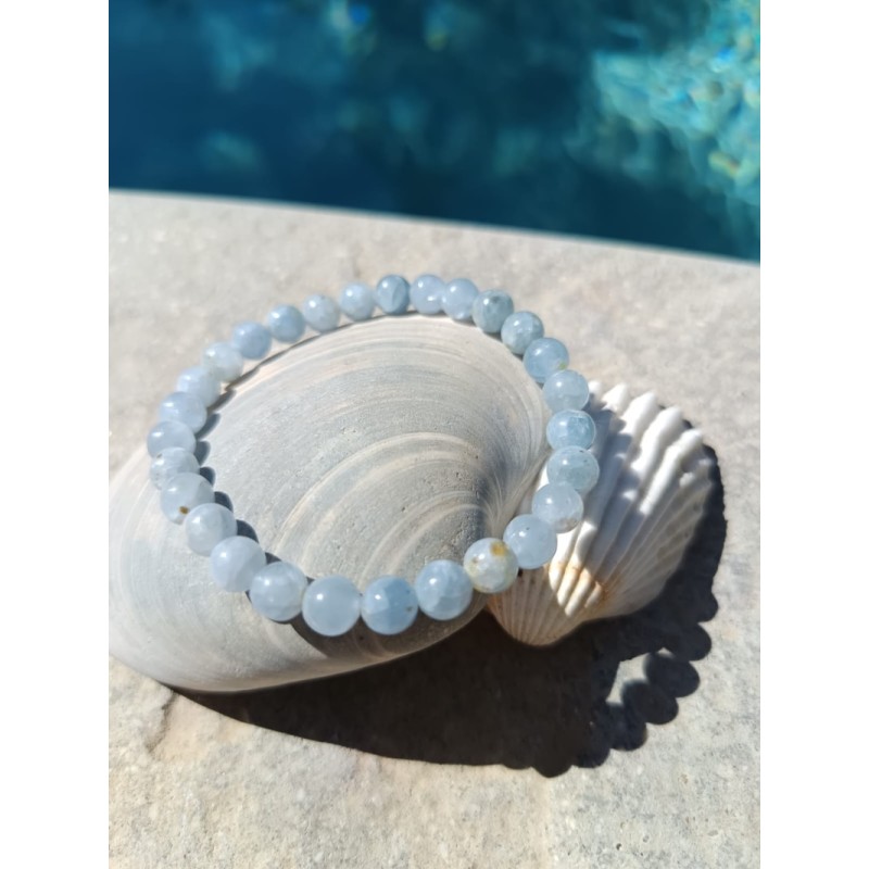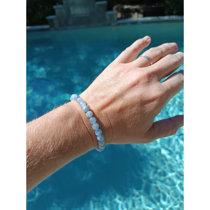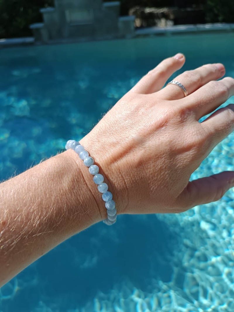 Portée en bracelet, la célestine agit tout au long de la journée comme un bouclier de paix, adoucissant les pensées et les émotions. Elle favorise une connexion naturelle avec la spiritualité, tout en recentrant l’esprit sur la douceur et l’équilibre émotionnel.