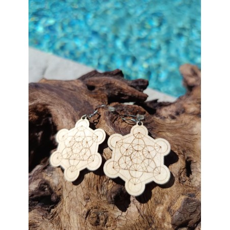 Boucles d’oreilles en bois naturel gravées du cube de Métatron, symbole sacré d’harmonie et de protection énergétique. Fabrication 100 % française