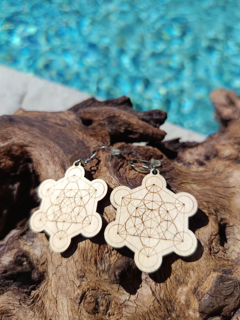 Ces boucles d’oreilles Métatron en bois naturel, créées par la PME française 3D Store dans le sud de la France, allient artisanat local et géométrie sacrée.