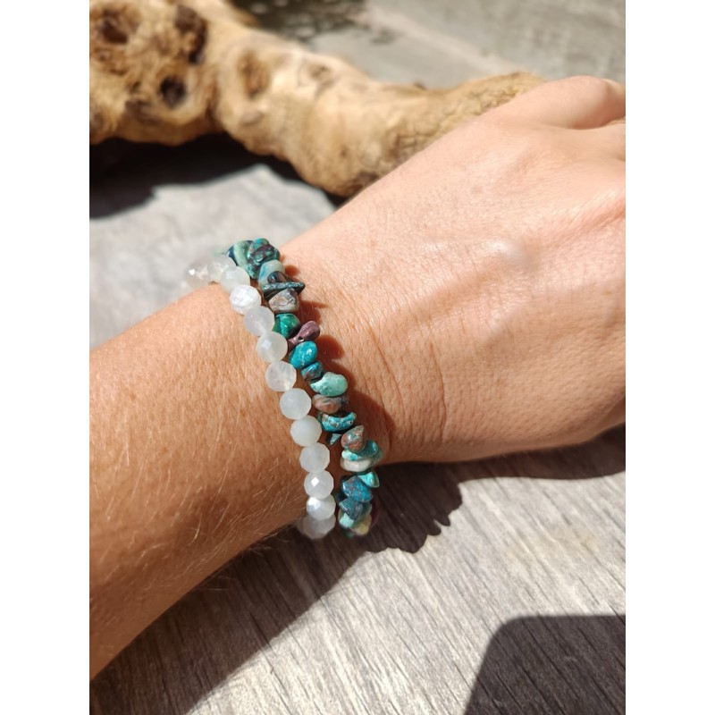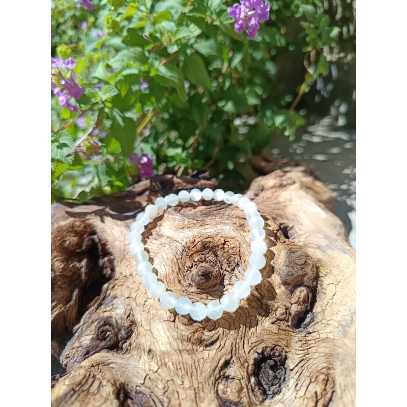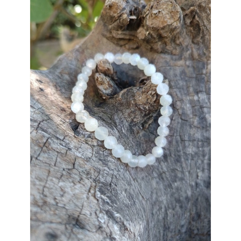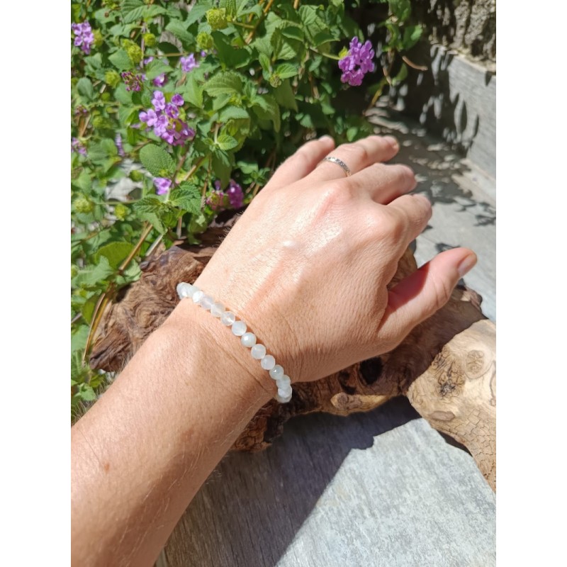 Ce bracelet en Pierre de Lune blanche naturelle, perles facettées de 6 mm, diffuse une énergie douce et lumineuse.