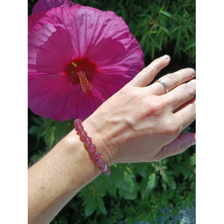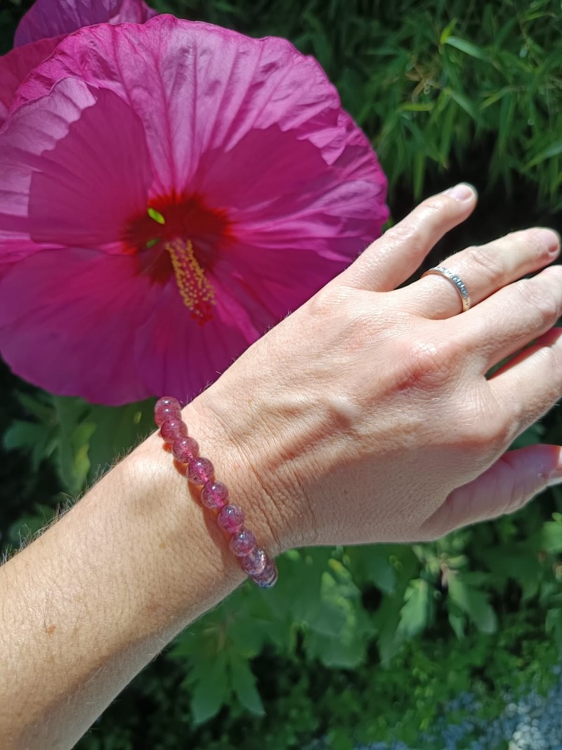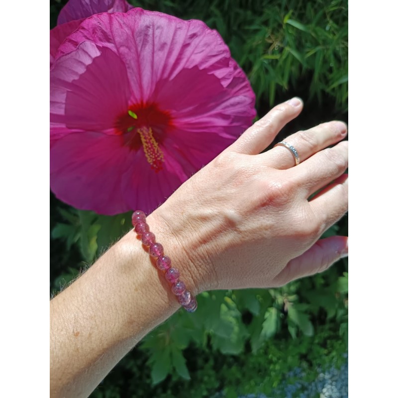 Ce bracelet en Quartz Fraise Hématoïde naturel associe la douceur du Quartz Rose à la vitalité de l’Hématite.