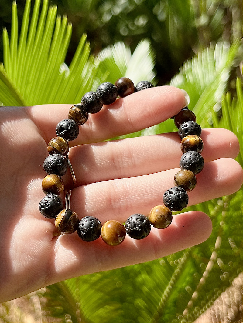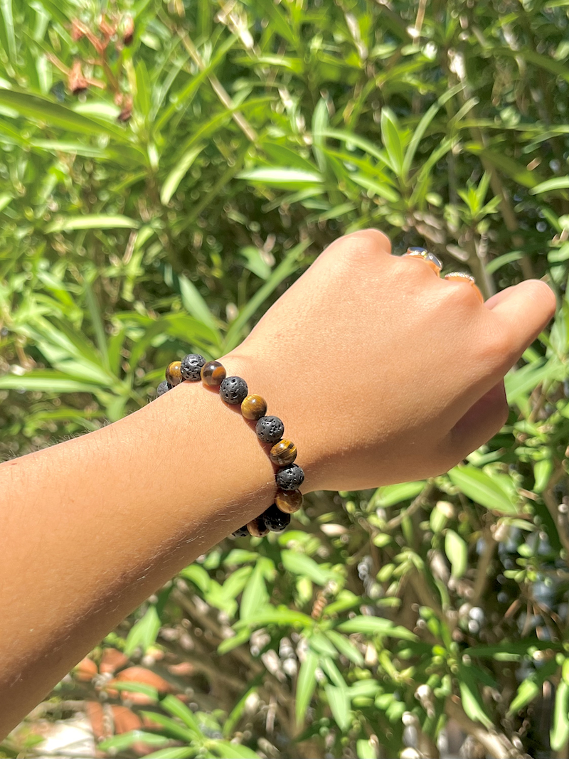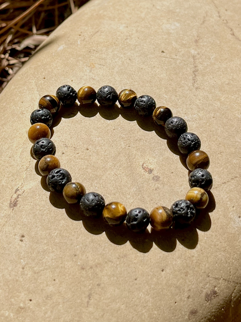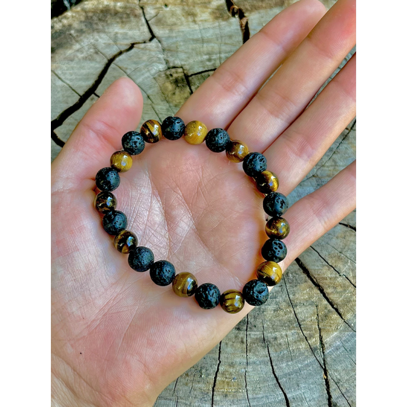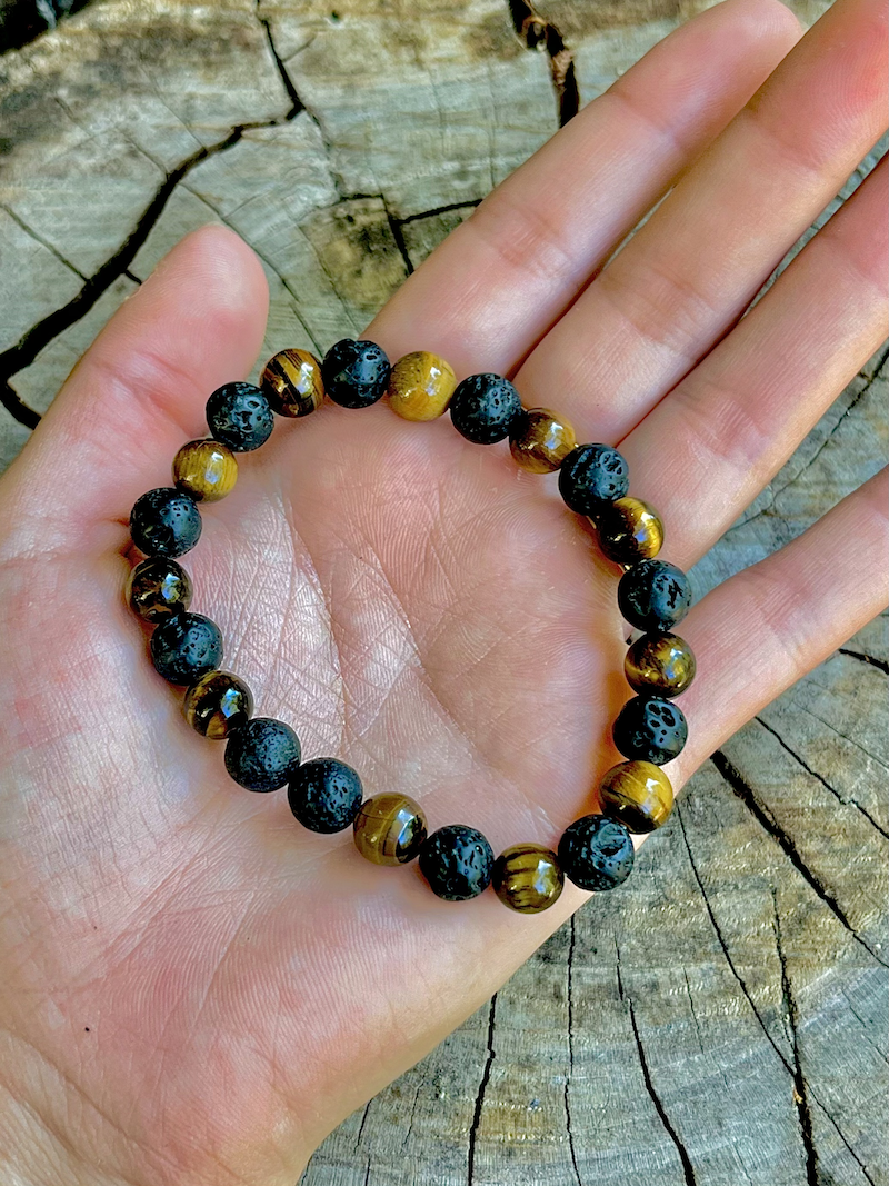 Perles de 8 mm en Œil de tigre doré et Pierre de lave naturelle.