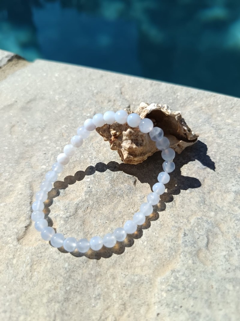 Entretien : Purifiez votre bracelet en calcédoine sous l’eau claire quelques minutes ou à l’aide d’un encens doux. Rechargez-le à la lumière lunaire ou sur géode d'améthyste pour conserver son énergie apaisante.
