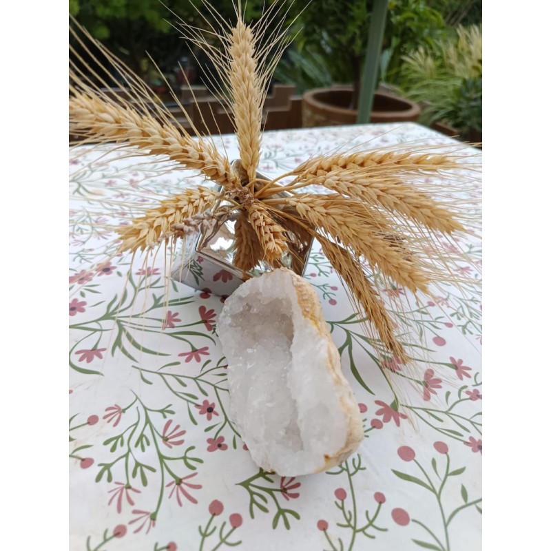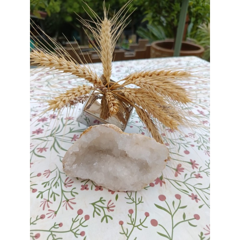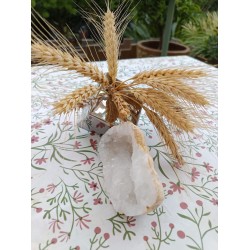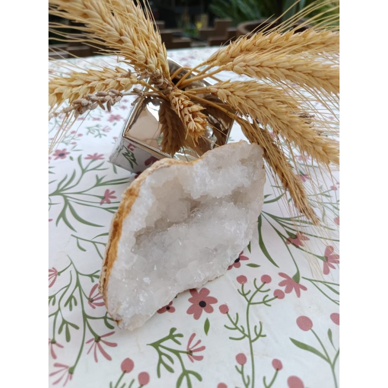 Découvrez cette superbe géode de cristal de roche de 273 grammes, issue des terres marocaines reconnues pour la pureté de leurs minéraux. Cet écrin naturel s’ouvre sur une cavité ornée de cristaux d’un blanc translucide et lumineux, apportant élégance et énergie à votre intérieur.