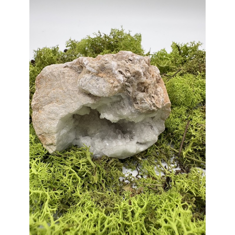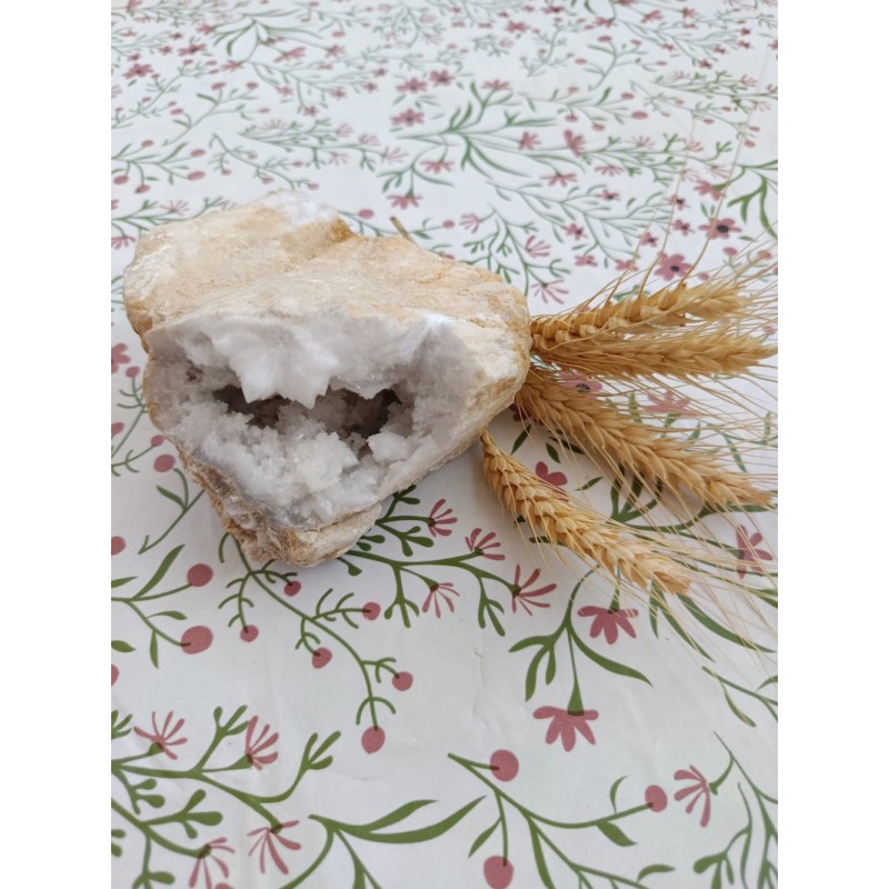 Géode en cristal de roche du Maroc, 663 grammes, cavité à ouverture plus discrète. Parfaite pour la purification et rechargement des minéraux, la décoration ou collection